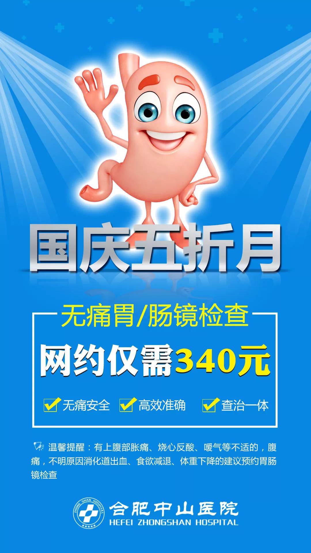 金秋十月好心境,为感谢各位市民朋友对合肥中山医院长期支持与信任,特此推出胃/肠检查五折惠民活动。