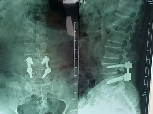 我院骨科团队第一时间了解患者情况,为其安排各项检查。邹先生被确诊为:L4、5椎间盘突出症(游离型),马尾神经综合征。患者大小便功能障碍已经5天,且症状逐渐加重,情况较为紧急,于是骨科团队为邹先生在急诊全麻下行:L4/5椎间盘脱出症腰后入路+L4、L5椎体钉棒内固定+全椎板切除术+椎管扩大减压神经根松解+椎间植骨融合器融合术,手术顺利,术中成功固定L4、L5椎体钉棒,并摘除卡压神经根处的髓核组织。