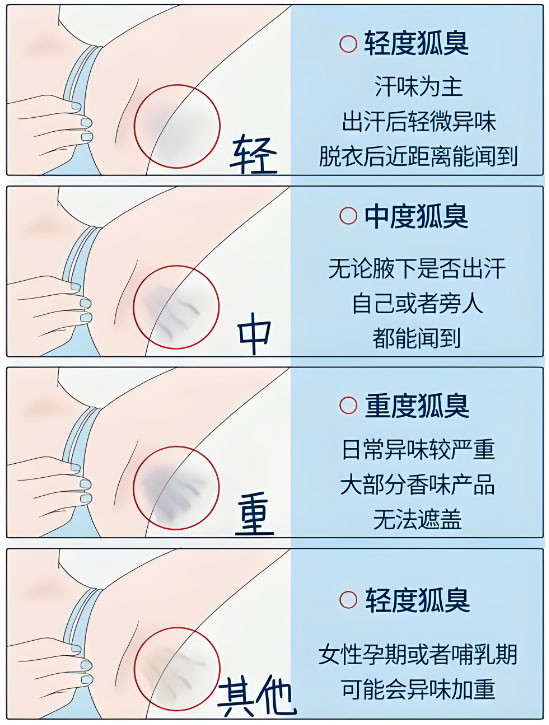 临床上,医生通常根据气味强度和社交影响,将腋臭分为三个等级: