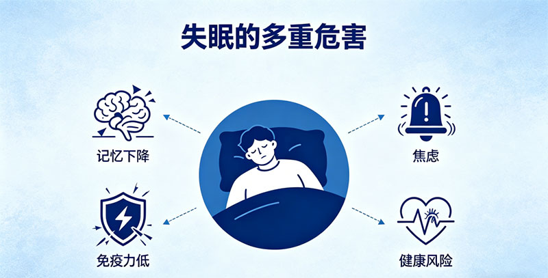 失眠是睡眠质量持续低下的状态,危害远超疲劳,会引发一系列连锁反应: